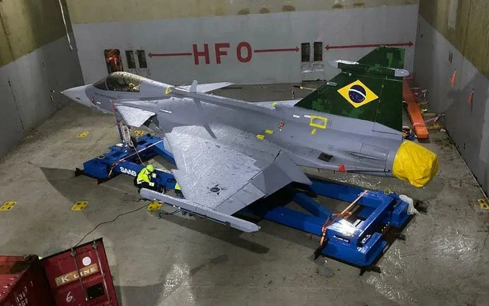 According to the portal Aeroin, the fighter is being transported by sea due to not yet being certified and lacking a refueling probe, which would hinder the crossing of the Atlantic Ocean.