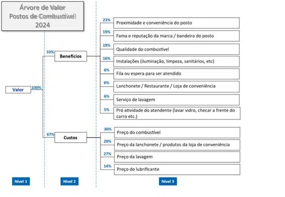 The Perceived Value considers the cost-benefit assessed by customers. Among the respondents, benefits accounted for 33% of the perceived value, with highlights on location (23%), brand reputation (19%), fuel quality (19%), physical facilities (16%), lines (6%), convenience store (6%), car wash service (6%), and attendants (5%). Costs weighed 67%, highlighting fuel prices (30%), snack bar prices (29%), car wash prices (27%), and lubricant prices (14%).
