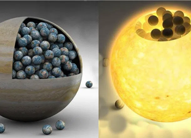 The universe is filled with impressive scales that challenge our imagination. Among them, the proportions between the bodies of our own Solar System are enough to cause admiration. Did you know that the Sun can hold about one thousand Jupiter-sized planets, and that Jupiter can hold approximately 1,000 Earth-sized planets within its volume?