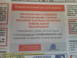 To apply for these positions, you will need to send your resumes to the email recrutamento.prosub@odebrecht.com, stating in the subject line the position – name – city of residence. Good luck to everyone, and when you are called, please let us know so we can keep track of the progress of the selection process. Some say these positions are fake, others say they contacted the company, and the response was that CVs should indeed be sent to this email; just in case, send them anyway. Remember that we will be raffling off free courses in the offshore, oil, and gas sector; learn the rules and how to participate by accessing this article.
