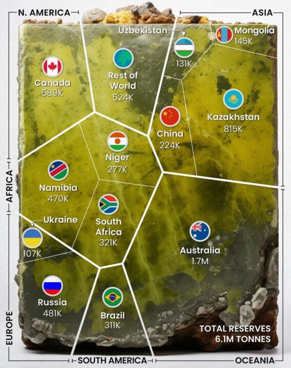We can see that Australia stands out completely from the rest of the world in terms of tons, with almost 1.7 million tons of uranium, representing 28% of global reserves. Kazakhstan has 815,200 tons (13% of global reserves), and Canada has 588,500 tons (10% of reserves). Followed by countries like Russia, Namibia, and South Africa.