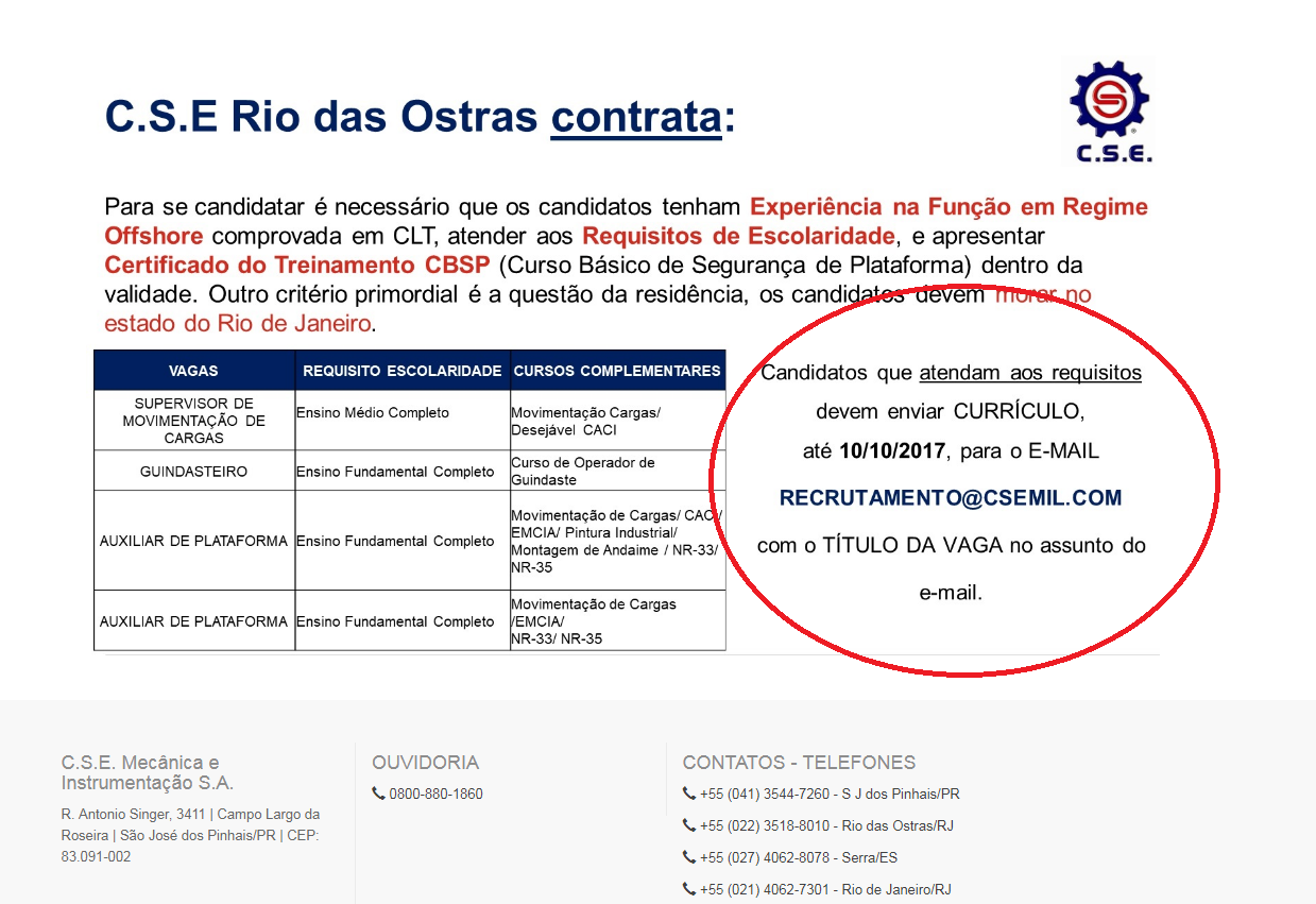 [supsystic-social-sharing id=’1′]Official offshore vacancies promoted by CSE, a company that now belongs to Aker Solutions. To apply, everyone must be aware that resumes must be submitted by October 10. It is also mandatory that all have proven offshore experience in the role, education must meet the requested standards, and Lifeboat training must be current. Applications from people who do not reside in the State of Rio de Janeiro will not be accepted, so please do not send emails if you do not meet the opportunity criteria. Here are more details on the required responsibilities: