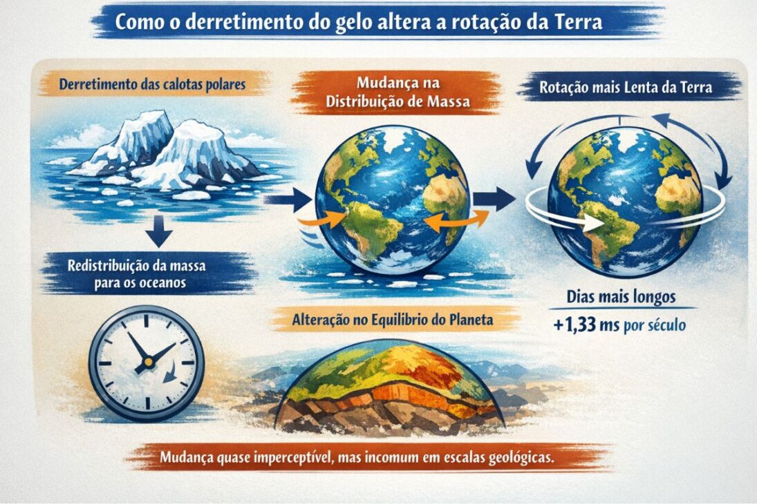 As global warming speeds up the melting of polar ice caps and large glaciers, huge volumes of water that were previously concentrated in polar regions begin to spread across the oceans. This redistribution of mass slightly alters the planet’s balance.