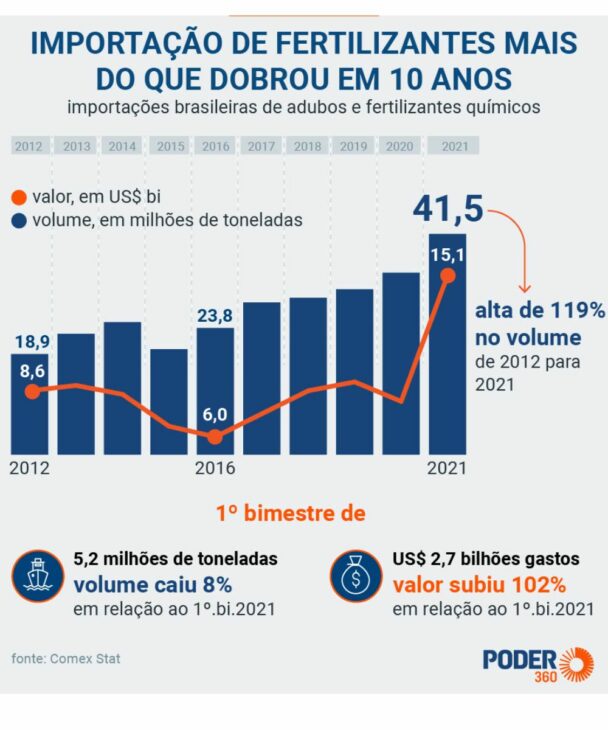 According to a survey conducted by the Portal360 team, fertilizer imports to Brazil reached 41.5 million tons in 2021. This represents an increase of 119% in volume over the last 11 years. Check the data in the graph below.