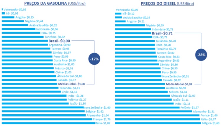 For diesel, in a sampling of 166 countries, the final price in Brazil is 28% lower than the global average and ranks 43rd, meaning it is lower than in 123 countries.