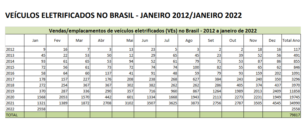 Also according to ABVE, January 2022 was the best month in the entire historical series for the electric car market in Brazil. A growth of 93% over the 1,321 registrations in January 2021 and 63% over January 2020 (1,568). See the details in the image below: