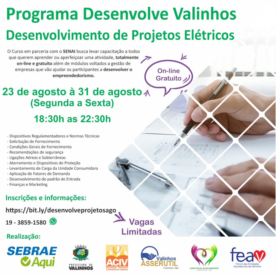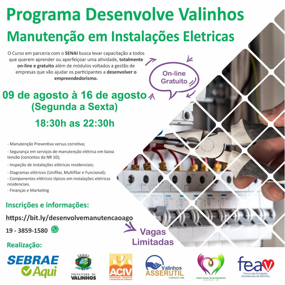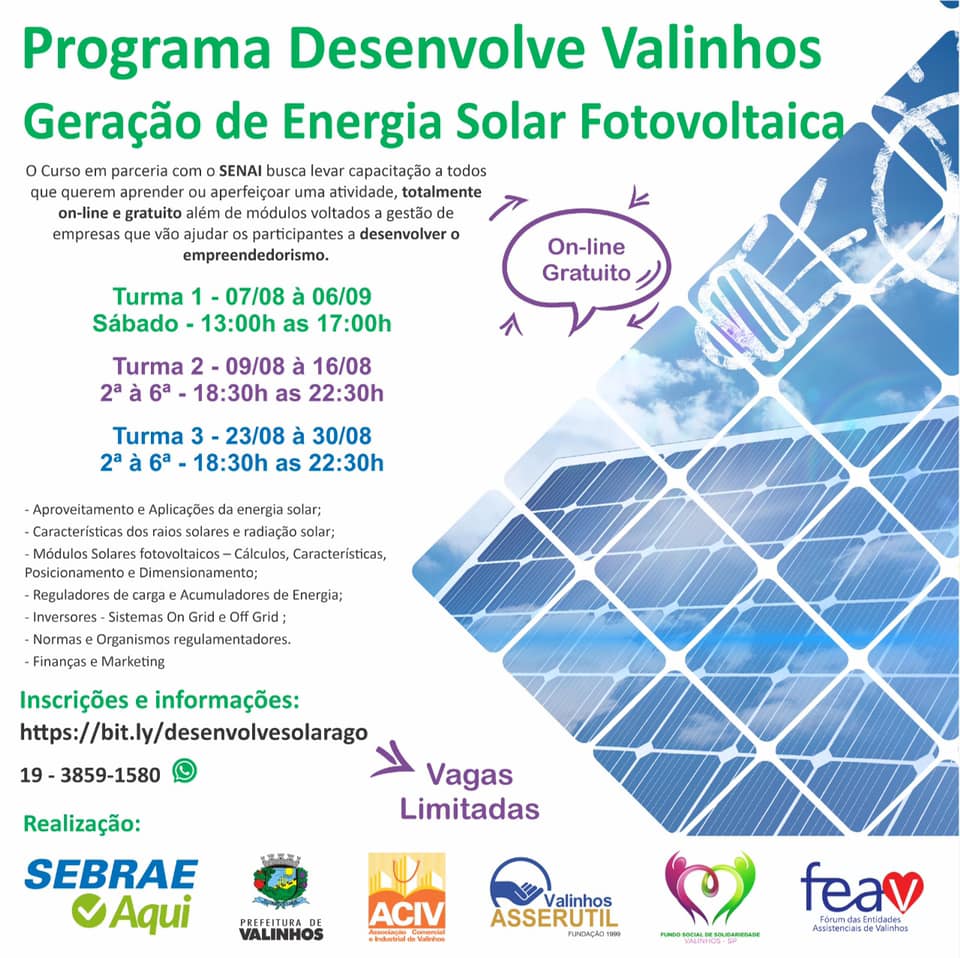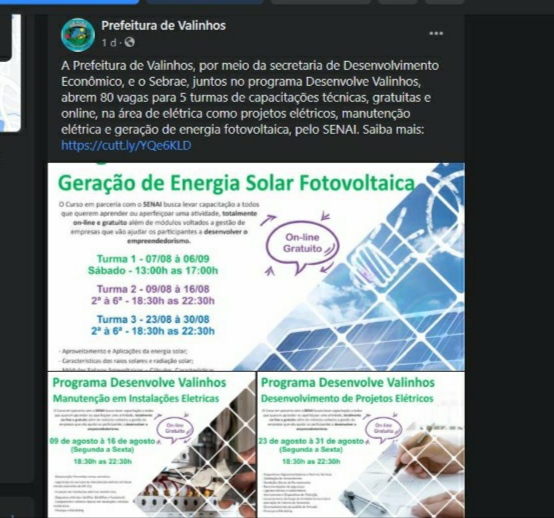 The City Hall of Valinhos – SP has commented on the free online and EAD courses offered in partnership with Senai, stating: “The City Hall of Valinhos, through the Department of Economic Development, and Sebrae, together in the Desenvolve Valinhos program, open 80 spots for 5 classes of free online technical training in the electrical area, such as electrical projects, electrical maintenance, and solar energy generation, through SENAI”. Check out the images: