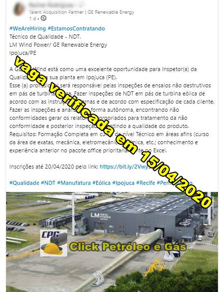 GE/LM Wind has an excellent opening for Quality Inspector for its plant in Ipojuca, Greater Recife (PE), check below all the requirements. Pay attention to the application deadline, which goes until 04/20/2020