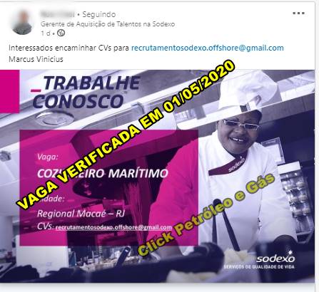 If you are a professional specialized in the above role and a resident of the Macaé region, immediately send your resume stating in the subject line the job title to recrutamentosodexo.offshore@gmail.com