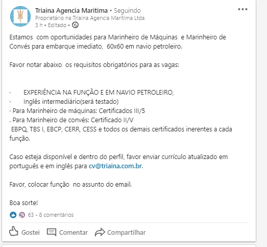 The company informs interested professionals for the vacancies, available to board on a 60 x 60 schedule and who meet all the requirements above, to send the updated resume in Portuguese and English via email, indicating the position in the subject line to: cv@triaina.com.br.