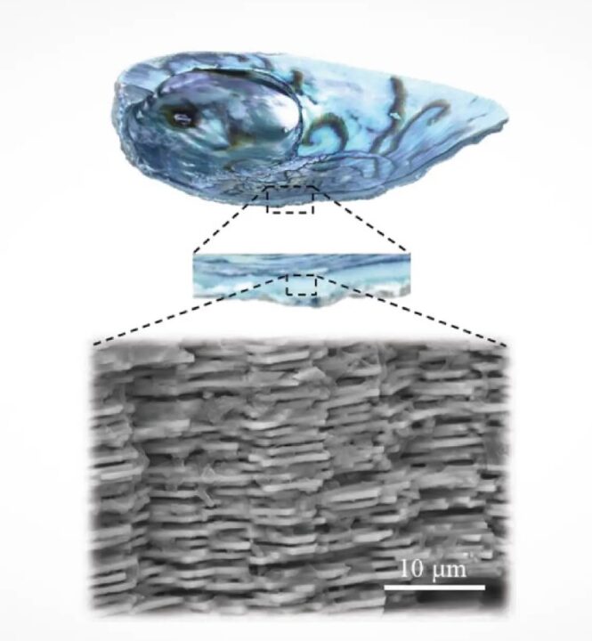 Moini’s lab often seeks inspiration from biology for their work in building materials. In this case, the team developed a compound inspired by a natural material known as nacre, or mother-of-pearl, which is found within certain shells. At the microscopic level, nacre consists of hexagonal tablets of the hard mineral aragonite bonded by a soft biopolymer.
