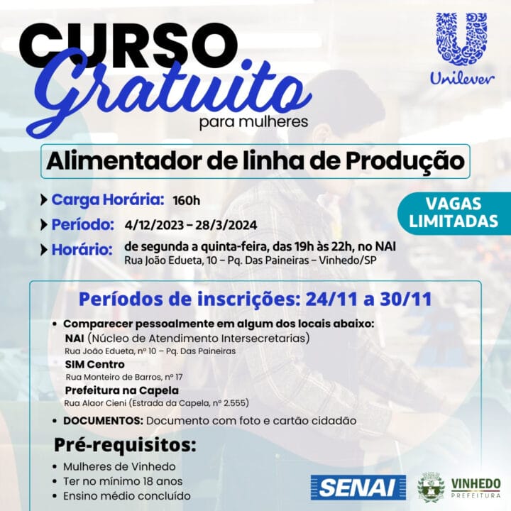 Applications for the free course offered by Senai in partnership with Unilever are open until November 30 and can be made in person at NAI (Rua João Edueta, 10 – Parque das Paineiras), at the Prefeitura na Capela (Estrada da Capela, 2.555 – Capela), or at SIM – Centro (Rua Monteiro de Barros, 17). With only 25 spots available, the order of arrival will be decisive. The opportunity is knocking at your door; don’t miss out on being part of this transformative journey.