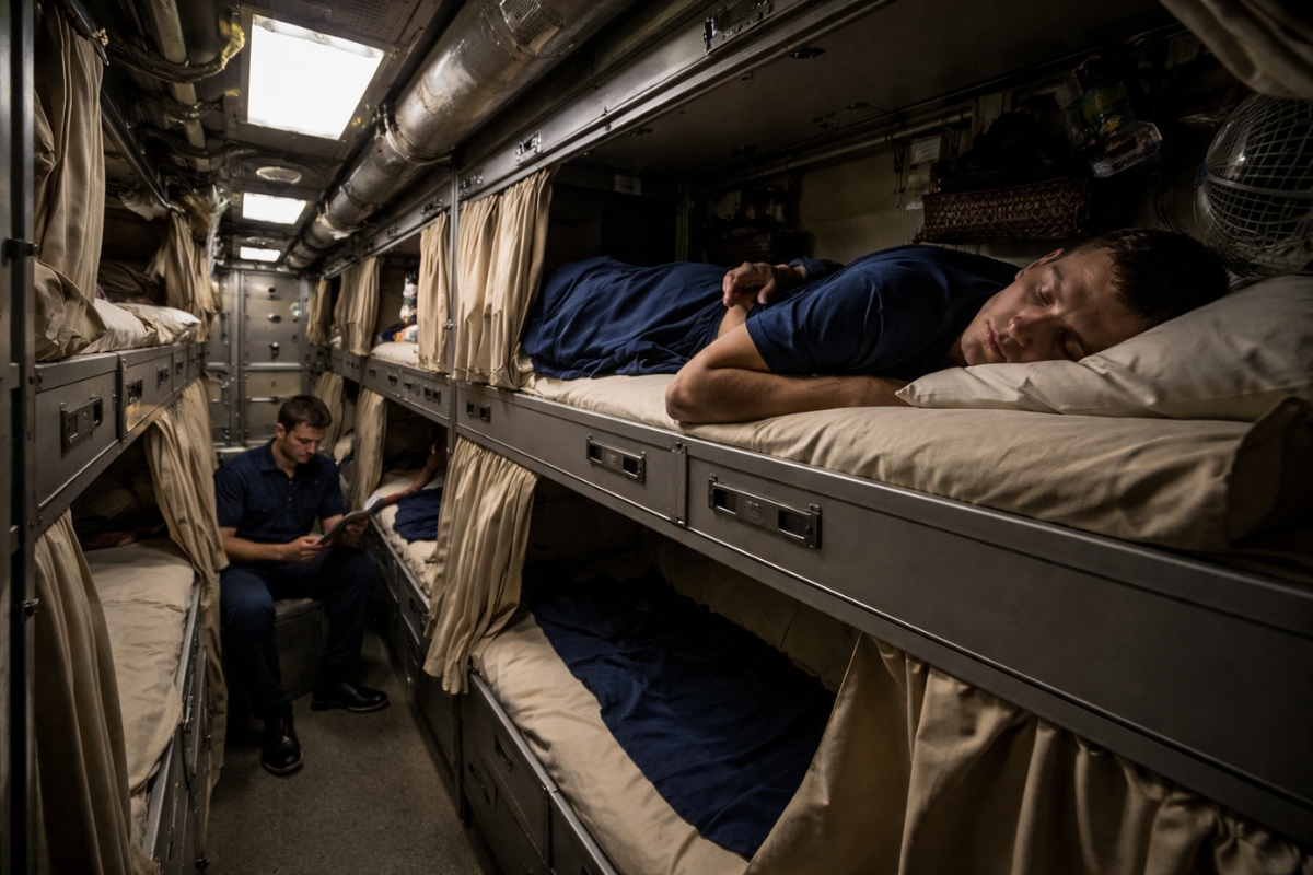 The sleeping quarters reflect the real pattern. Hammocks stacked in rows, closed curtains, and uniforms hung outside. The goal is to reduce light, noise, and unnecessary movement. Privacy is minimal, and rest must be protected as an operational resource.