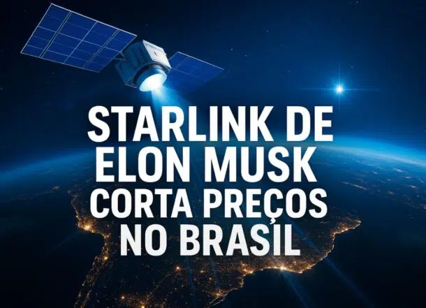 Imagem digital mostra satélite Starlink em órbita sobre o Brasil, com feixes de sinal iluminando áreas remotas, acompanhada de texto promocional sobre corte de preços
