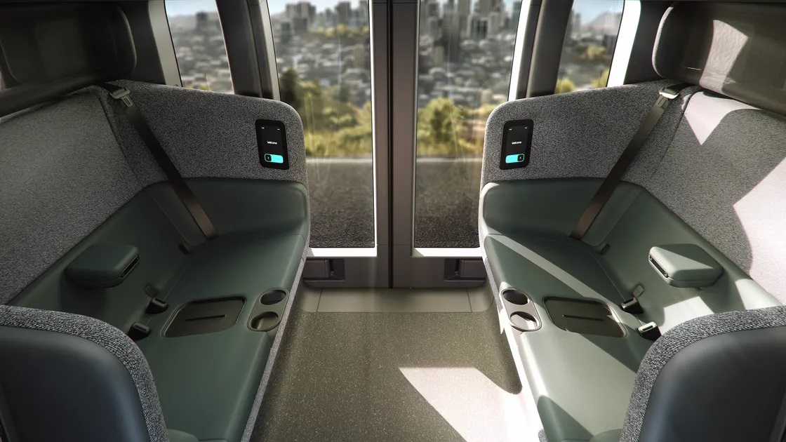 The interior of the vehicle is less high-tech. The cozy inward-facing seats (hence the term “carriage-style”) are surrounded by what appears to be textured fabric. The seats also conceal what the company claims is a radical reworking of how airbags function. There are cup holders and wireless charging mats between the seats. And the ceiling features a starlight pattern, commonly seen in luxury vehicles like the Rolls Royce Ghost. A small touchscreen at each seat is the most advanced technology found inside the vehicle.