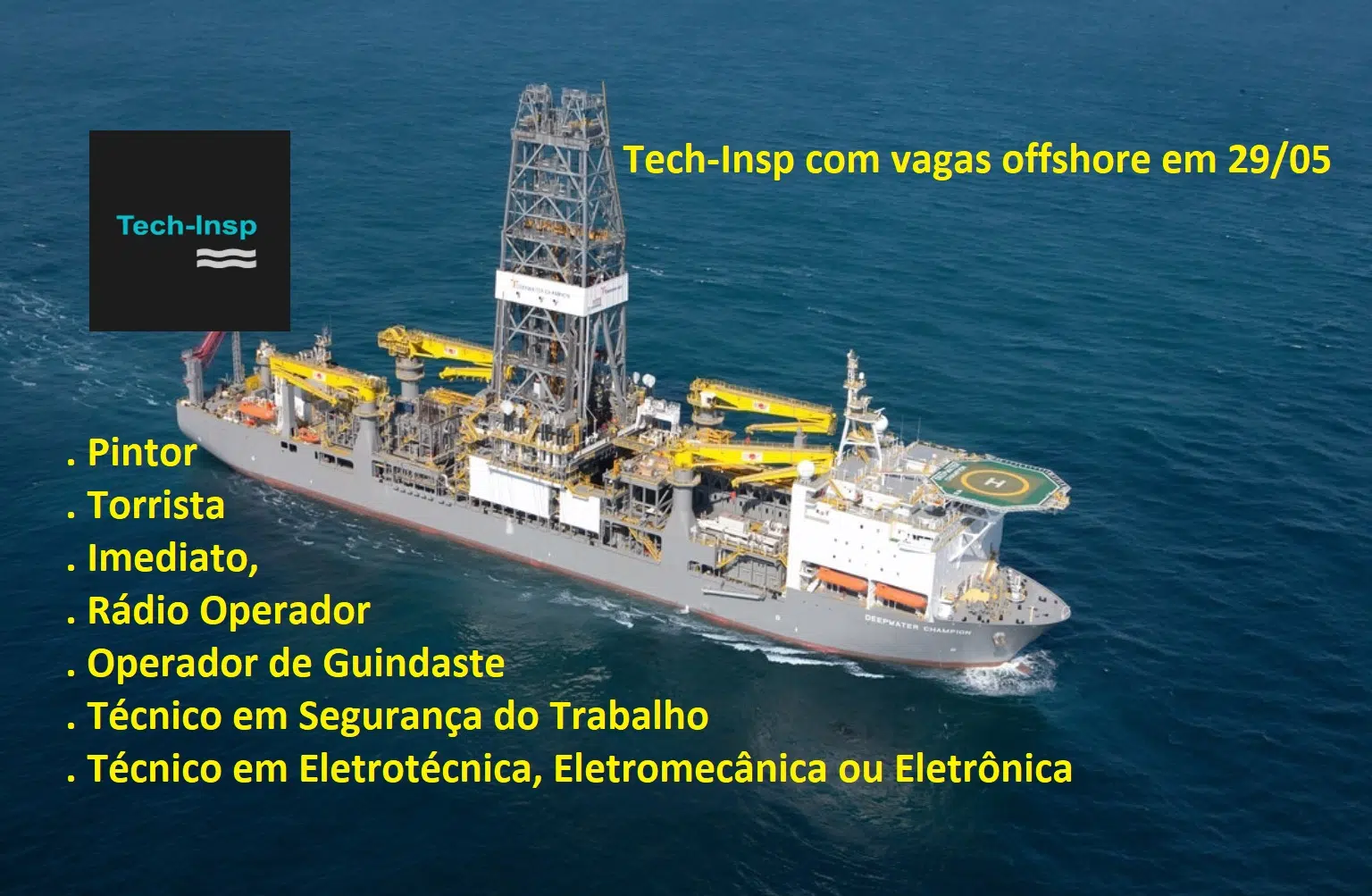 Tech-Insp, a company specialized in the Petrochemical and Naval sectors, has just announced many offshore job openings for the positions of Radio Operator, First Officer, Painter, Crane Operator, Electrotechnical Technician, Electromechanical or Electronic Technician, Occupational Safety Technician, and Roustabout, indicating that these positions are likely to meet the demand for its first contract with Petrobras, which involves Support for Operation and Maintenance of Drilling Rigs for the Brazilian oil company.