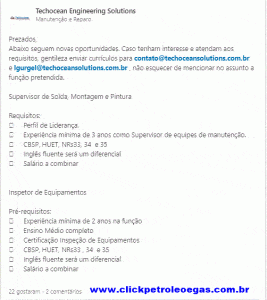 Technocean has just opened another selection process a few days ago for the offshore maintenance and repair area. The educational and experience requirements are quite varied, so please be attentive and responsible when applying. Avoid sending resumes indiscriminately and for positions where you do not meet the qualifications, as this may result in the company blocking you or your contact being flagged by the company’s anti-spam systems. Here are the details: