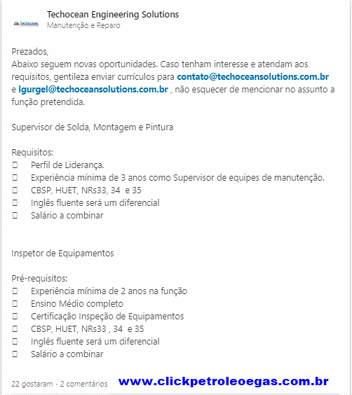 If you are interested and meet the requirements, please send your resumes to contato@techoceansolutions.com.br and lgurgel@techoceansolutions.com.br, and do not forget to mention the position you are applying for in the subject line. Stay tuned because Aker Solutions has just been cleared to build a maintenance and assembly center in Macaé and will be hiring many people, both for the construction of the factory and for the project.