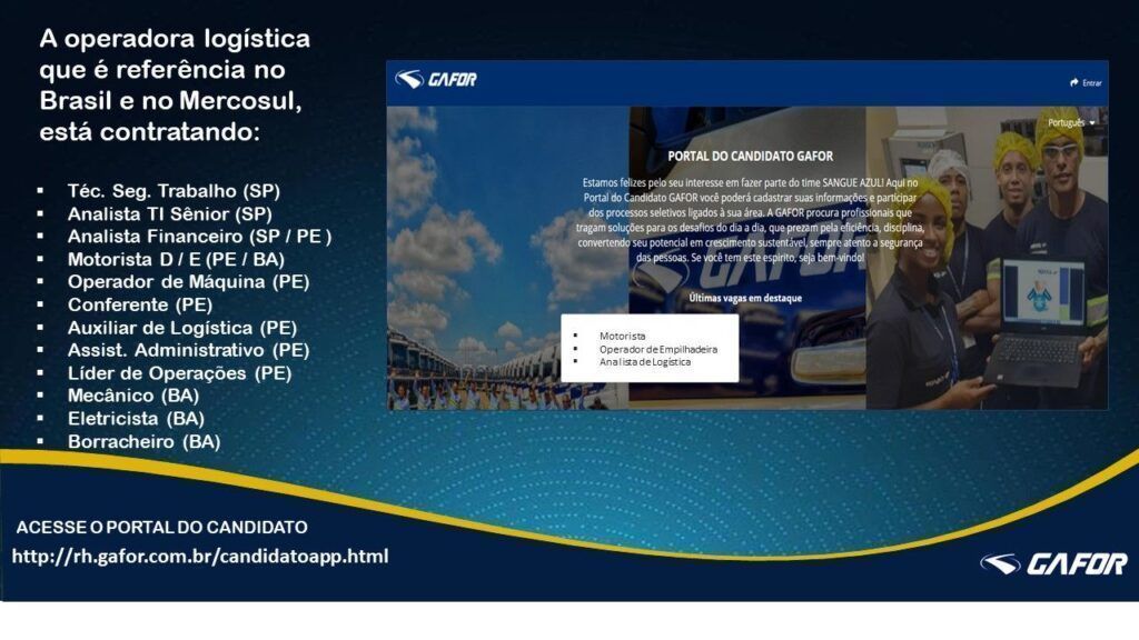 Gafor Transportation and Logistics is looking for professionals who bring solutions to everyday challenges, who value efficiency and discipline, turning their potential into sustainable growth, always mindful of people’s safety. The company announced today (9th), through its official communication channels, that it has job openings for different positions in the states of São Paulo, Pernambuco, and Bahia.