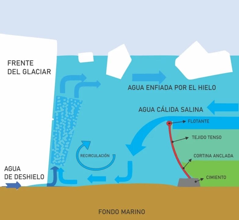 The idea is to place perforated pipes about 100 meters high and 62 miles long (about 100 kilometers) on the ocean floor, near the glacier. These pipes would be connected to a compressed air source that would create a bubble barrier rising from the seabed to the surface. These bubbles would prevent the warm, salty seawater circulating in the depths of the ocean from reaching the glacier and melting it from below. In this way, it would give the glacier time to regain its thickness and stability.