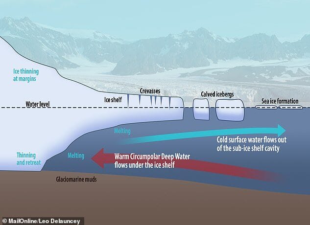 Why is this glacier so important? Because it has the potential to cause a catastrophic increase in sea level if it melts completely. The Thwaites Glacier already contributes 4% of the global rise in sea levels by dumping billions of tons of ice into the ocean every year. Its total collapse could raise sea levels by more than 60 centimeters. But that’s not all. The Thwaites Glacier also acts as a lid that prevents warm seawater from reaching other larger glaciers behind it. If the Thwaites collapses, it could trigger a chain reaction that could raise sea levels by another three meters.