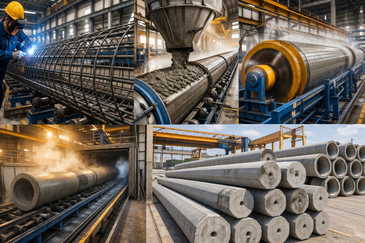 The factory shows how PHC piles and precast tubes are made; steel turns into a welded cage, high-strength concrete enters the mold, spins in centrifugation, cures in steam, and is ready in hours.