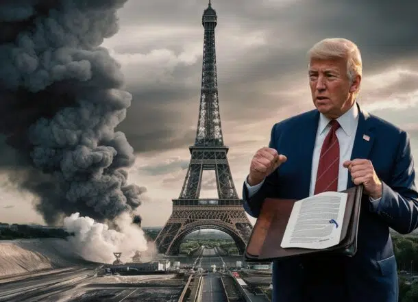 Donald Trump em frente à Torre Eiffel, simbolizando a retirada dos EUA do Acordo de Paris e o foco nos combustíveis fósseis.