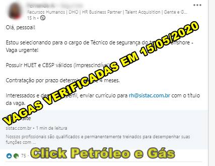 Amid the pandemic, Safety Technicians are being called today (14) for URGENT job openings by Sistac, the leader in inspection, maintenance, and repair offshore in the oil and gas industry in Brazil.