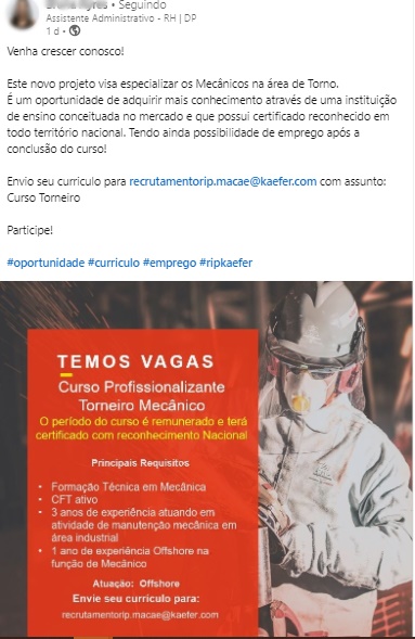 Application: Interested individuals must send their resumes to recrutamentorip.macae@kaefer.com. Good luck!