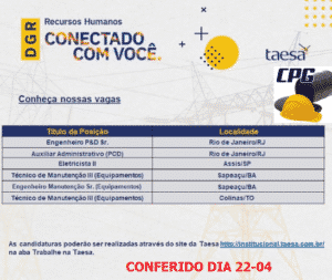 The city of Rio de Janeiro, São Paulo, Bahia, and Tocantins have job openings at Taesa, the largest electricity transmission group in Brazil, for projects that require specialized professionals in various technical and higher education areas.