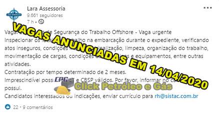 Amid the pandemic, Safety Technicians are called today (14) for URGENT job vacancies by Sistac, a leader in inspection, maintenance, and repair services offshore in the oil and gas industry in Brazil. Mechanics, welders, scaffolders, and more vacancies for maintenance shutdowns in the ArcelorMittal area