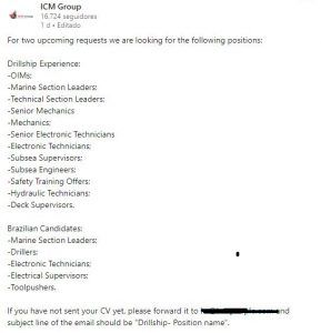 Although recruitment is international, the offshore activities will occur in Brazil itself. Interested candidates within the positions can send their resumes to the email hr@icmpeople.com IN ENGLISH, stating the name in the subject line as “Drillship – Position Name”. There is no point in using Google Translate, as you will not have this resource during the interview.