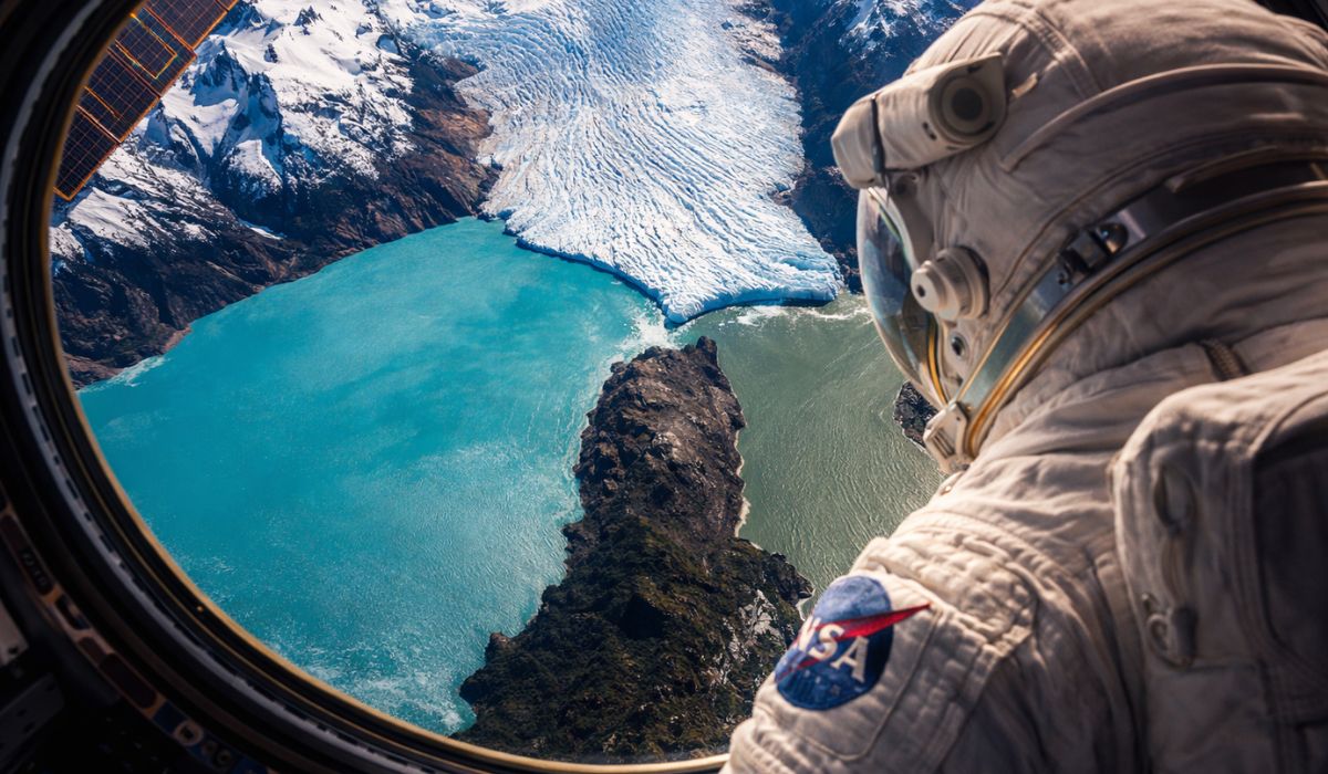 Seen from space, an image taken by an astronaut shows in Argentine Patagonia the exact point where a colossal glacier, a turquoise-blue lake, and a greenish arm of water meet, creating one of the rarest and most impressive landscapes in the region.