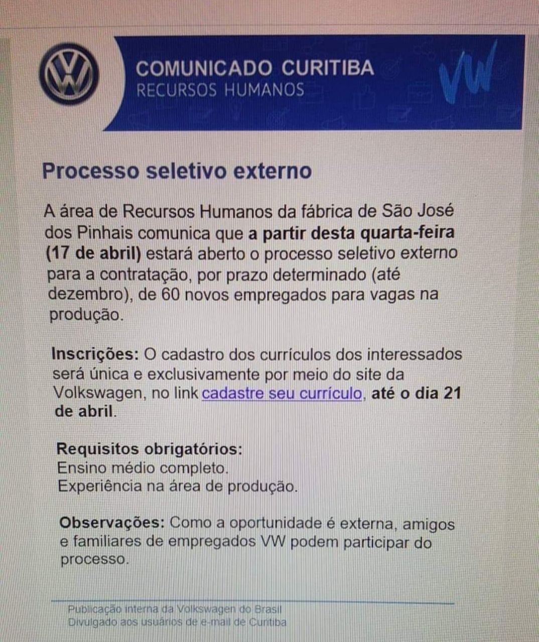 The Human Resources department at the São José dos Pinhais plant announced on April 16 that it has opened 60 positions for production. The deadline for applications is until April 21, 2019, and the selection process will remain open until December, so stay calm, as the company has until December to call candidates!