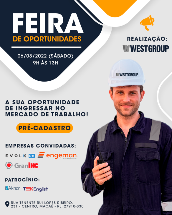 The West Group, an offshore professional center located in the city of Macaé (RJ), announced last Monday, August 1, a fair for offshore job vacancies this Saturday, August 6, featuring participation from major brands such as GranIHC, Engeman, Evolk RH, and many others.